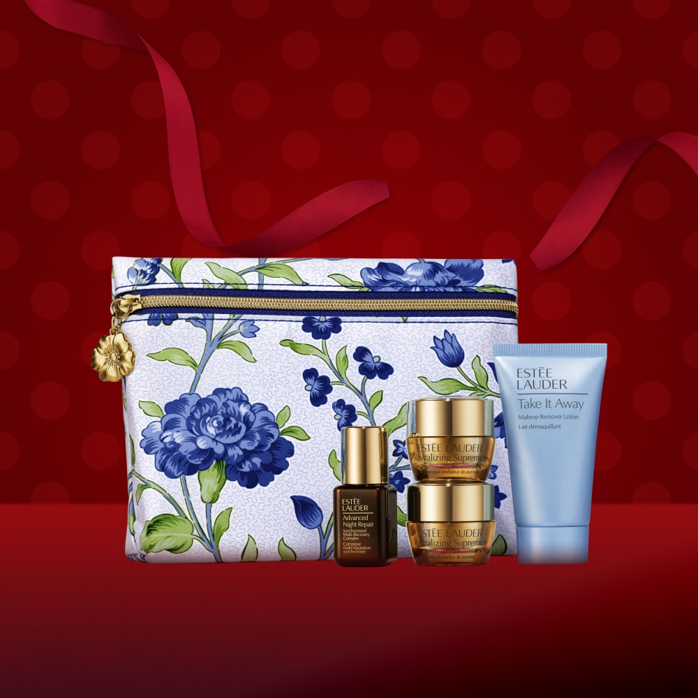 Dieses Blockbuster-Set 2025 enthält: Advanced Night Repair Serum und Eye Gel-Crème, Revitalizing Supreme+ Moisturizer, 2 Lippenstifte, Re-Nutriv Handcreme und mehr — alles in einem exklusiven Beauty-Train-Case.